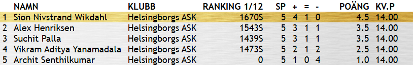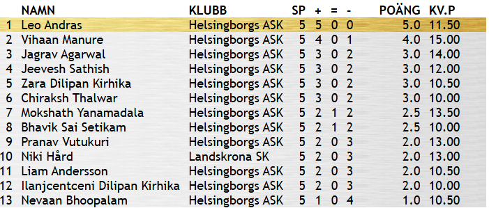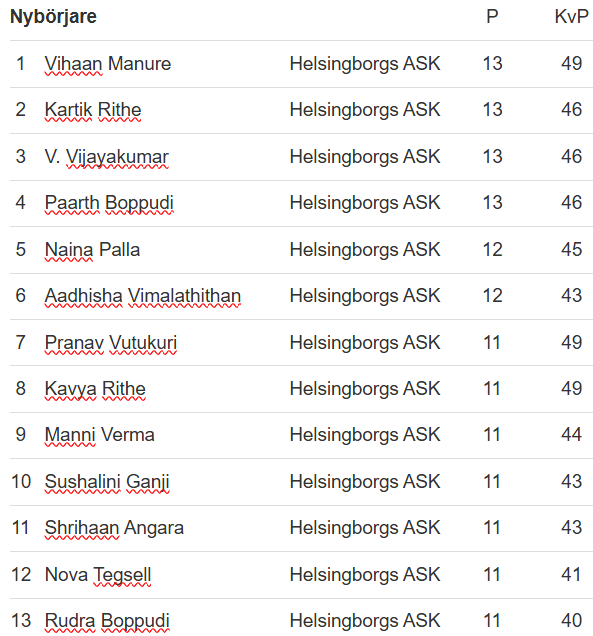 Det kom hela 26 spelare till start i nybörjarklassen. Det blev också mycket jämt med flera spelare inblandade i toppstriden. Till slut hade Vihaan Manure (HASK) kvalitetspoängen på sin sida men det var många som kunde hamnat i toppen. Vi får se om det finns någon blivande stjärna i startfältet.