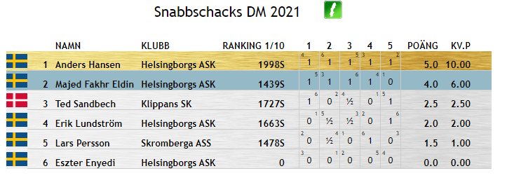 Tyvärr lockade dagens Snabb-DM (15 minuter + 5 sekunders increment) bara 6 deltagare. Några fler deltagare, både bland lägre rankade och högre rankade ifrån distriktet hade varit glädjande. Inte för att det störde oss som deltog, spelglädjen sprudlade. Distriktsmästaren Anders Hansen, Helsingborgs ASK var inte en självklar segrare, han (jag) var pressad i partierna mot Lars Persson och Eszter Enyedi. Dessutom så är hans klubbkamrat Majed Fakhr Eldin en ’coming man’ med lite för låg ranking och det visade han idag. Med stabilt spel kom han tvåa. Trea blev Ted Sandbech, Klippans SK som inte är någon duvunge. Han har bland annat ett par segrar mot en av distriktets bästa spelare, Tomas Rosell.