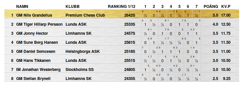Nr 1 på den svenska rankinglistan, Stormästaren Nils Grandelius, segrade i lördagens snabbschackstävling i Limhamn på 5 poäng. Med en poäng mindre hamnade Nils Stormästarkollega Tiger Hillarp Persson på andra plats. Tävlingen fick en fin inramning eftersom den spelades på klasskrogen Bistro Stella Limhamn som dessutom var en av sponsorerna.