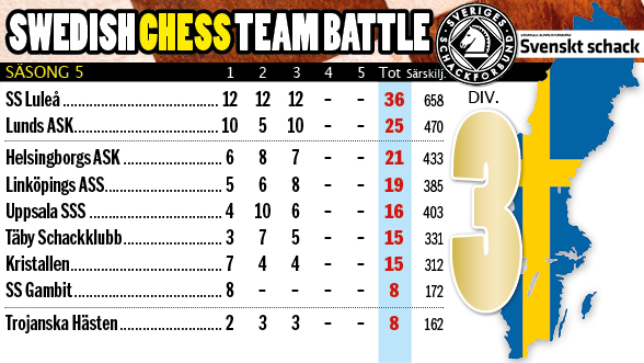 Helsingborgs ASK ligger 3:a i onlinetävlingen Swedish Chess Team Battle division 3 när två omgångar återstår. De två främsta i varje division går upp så nu gäller det för HASK att mobilisera allt vad man har om vill gå upp. Man jagar Lunds ASK och det är en bit upp till  dom så allt måste klaffa om det ska bli en uppflyttning. Nästa rond spelas nu på söndag den 24 januari kl 18.15 på lichess.org. Se tabellställningen här nedan: