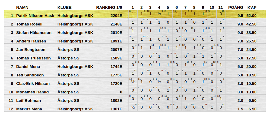 | Plac | Namn | Klubb | Elo | Poäng | Kvp |