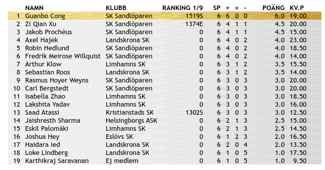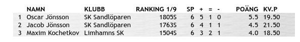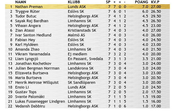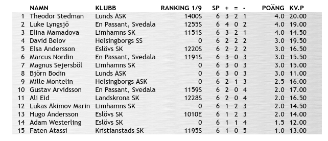 Resultat Sveriges Schackförbunds turneringssystem: https://member.schack.se/ShowTournamentServlet?id=10669