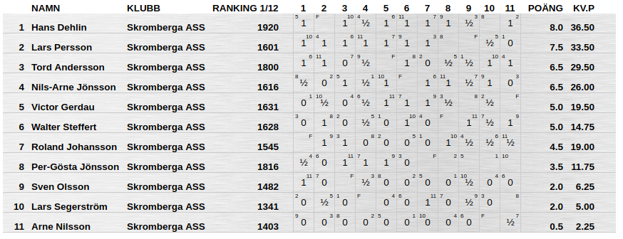Hans Dehlin segrade i Skrombergas klubbmästerskap som spelades klart igår. Det var ingen större överraskning att Hans vann, han var högst rankad. En liten överraskning hittar vi dock på silverplatsen, Lars Persson. Han var rankad 7:a. Bronsplatsen gick till Tord Andersson. Övriga placeringar hittar du i tabellen nedan (klicka på den för en större version).
