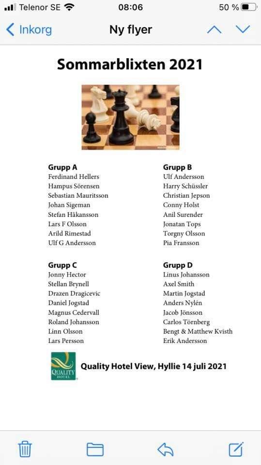 32 speciellt inbjudna spelare, bland dom fanns tre nordvästskåningar, spelade blixt (5 min + 3 sek) i fyra 8-manna förgrupper (se nedan). Stormästare blandat med glada amatörer som synes.